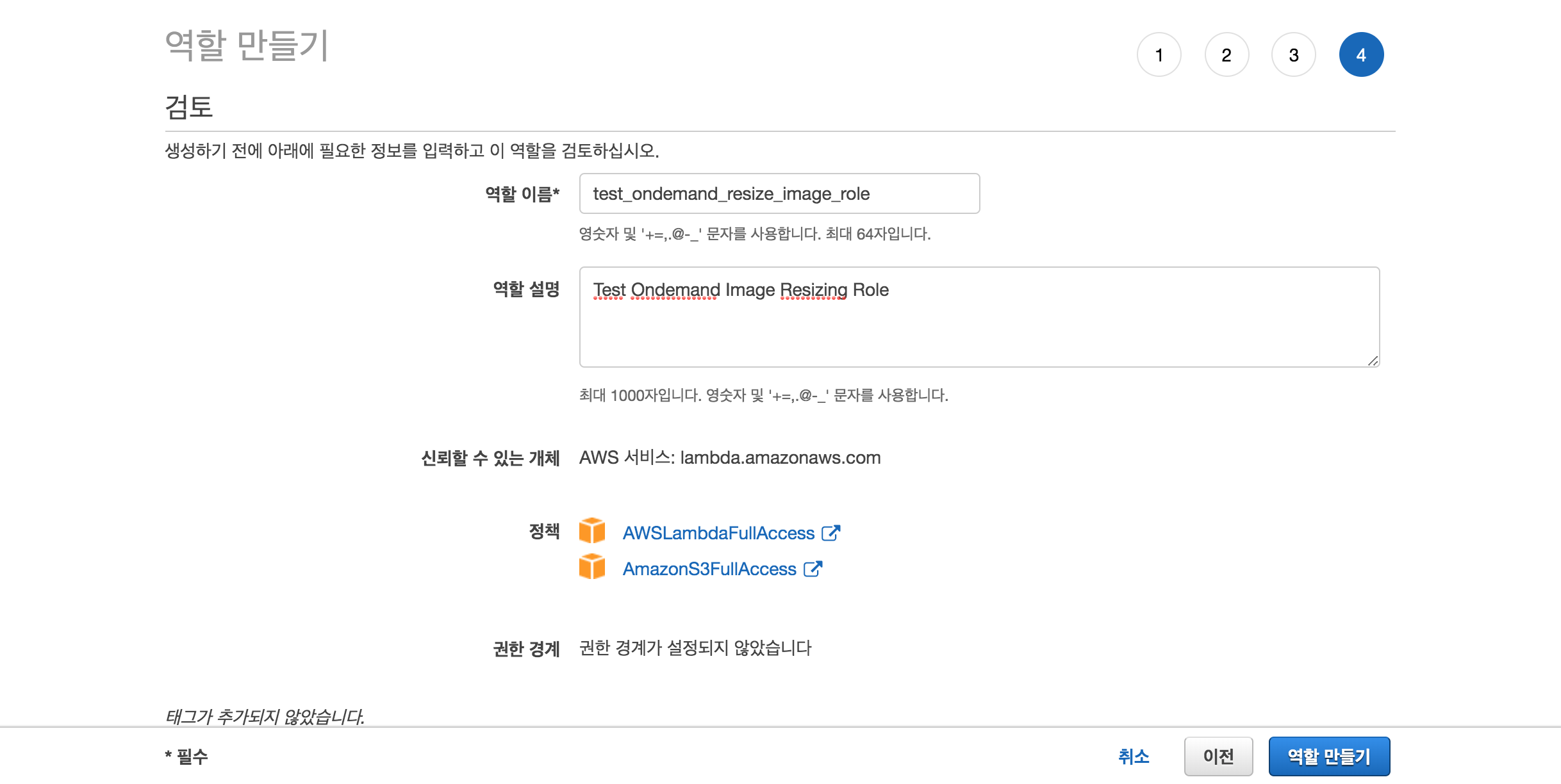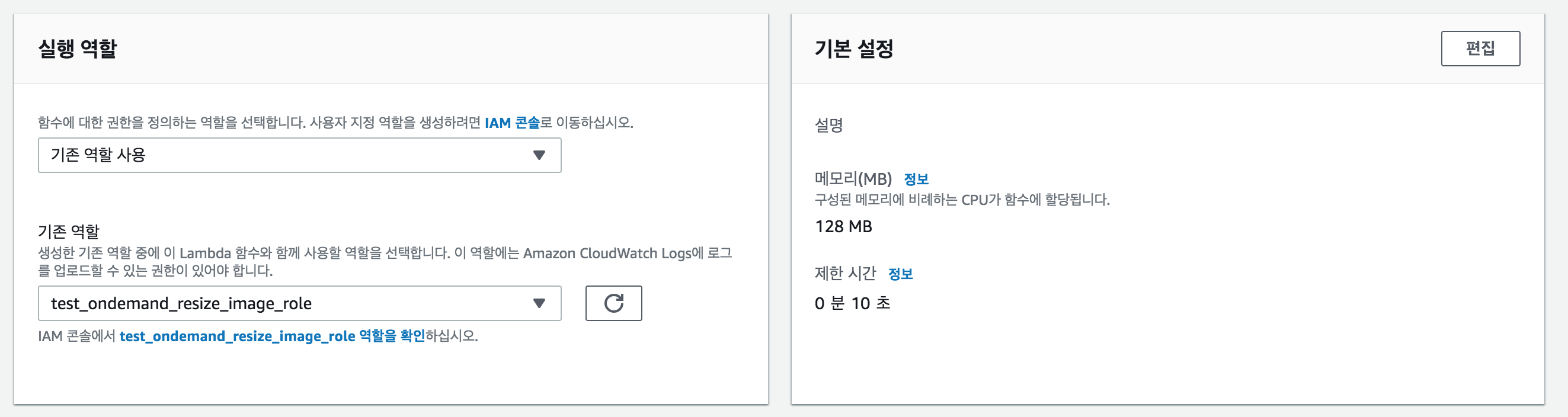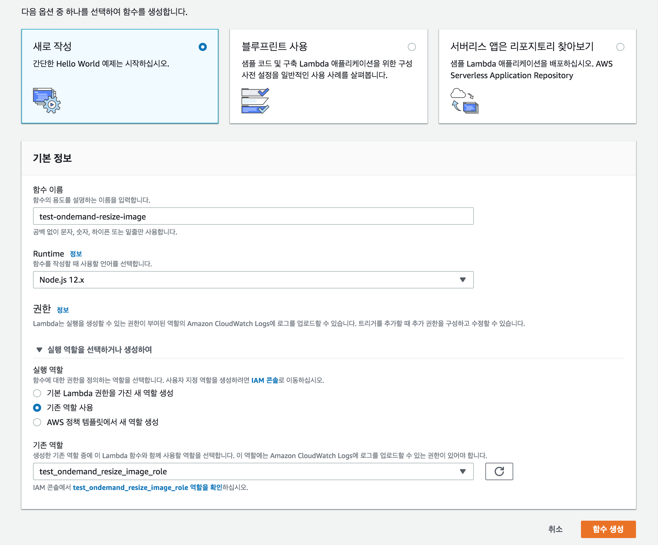'함수 이름'을 작성 후, 권한에서 맨 처음 만들었던 IAM 역할을 '기존 역할'로 지정해줍니다. 그리고 '함수 생성'을 클릭합니다.