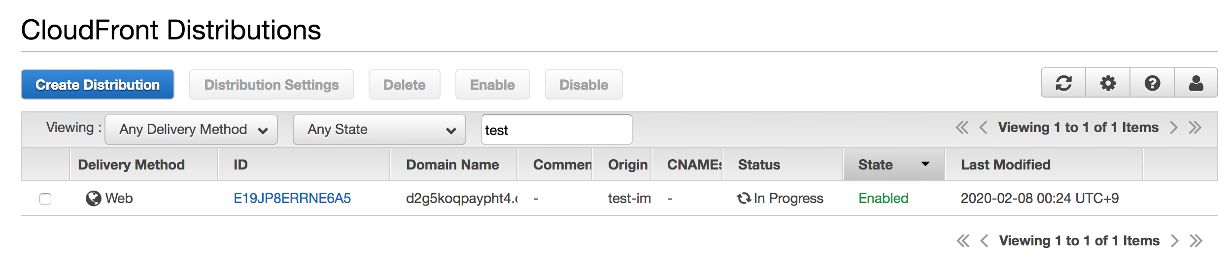 CloudFront로 돌아가면 'In Progress' 상태로 변경됩니다.
