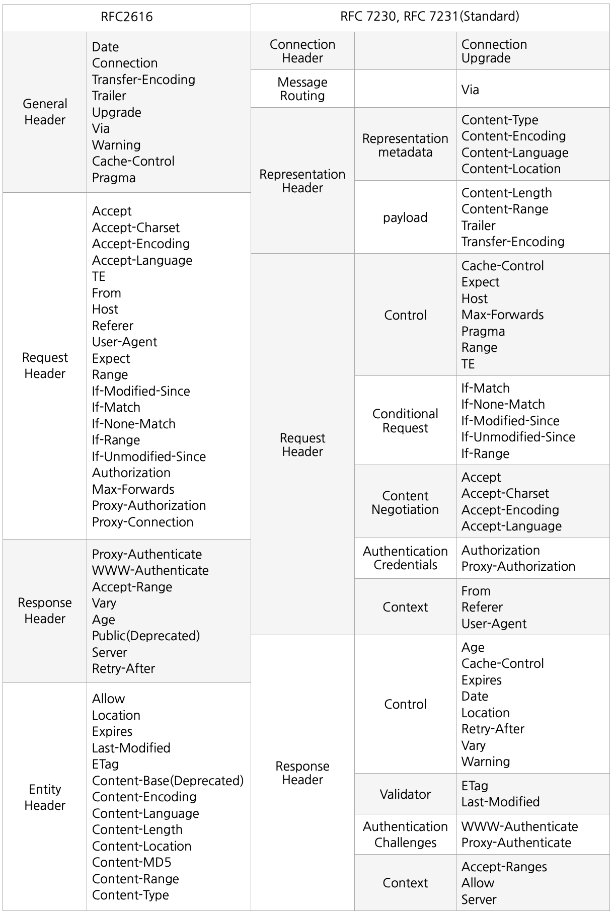 그리고 헤더들을 한 표로 정리해봤습니다.