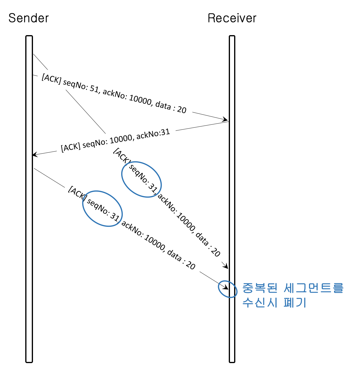 손실되지 않은 세그먼트에 대한 확인 응답만 전송하기 때문에, 확인 응답이 도착하지 않은 세그먼트의 ackNo는 송신자측의 재전송 타이머(RTO Timer)에 의해 세그먼트를 재전송함으로 손실된 세그먼트에 대한 복구를 한다.