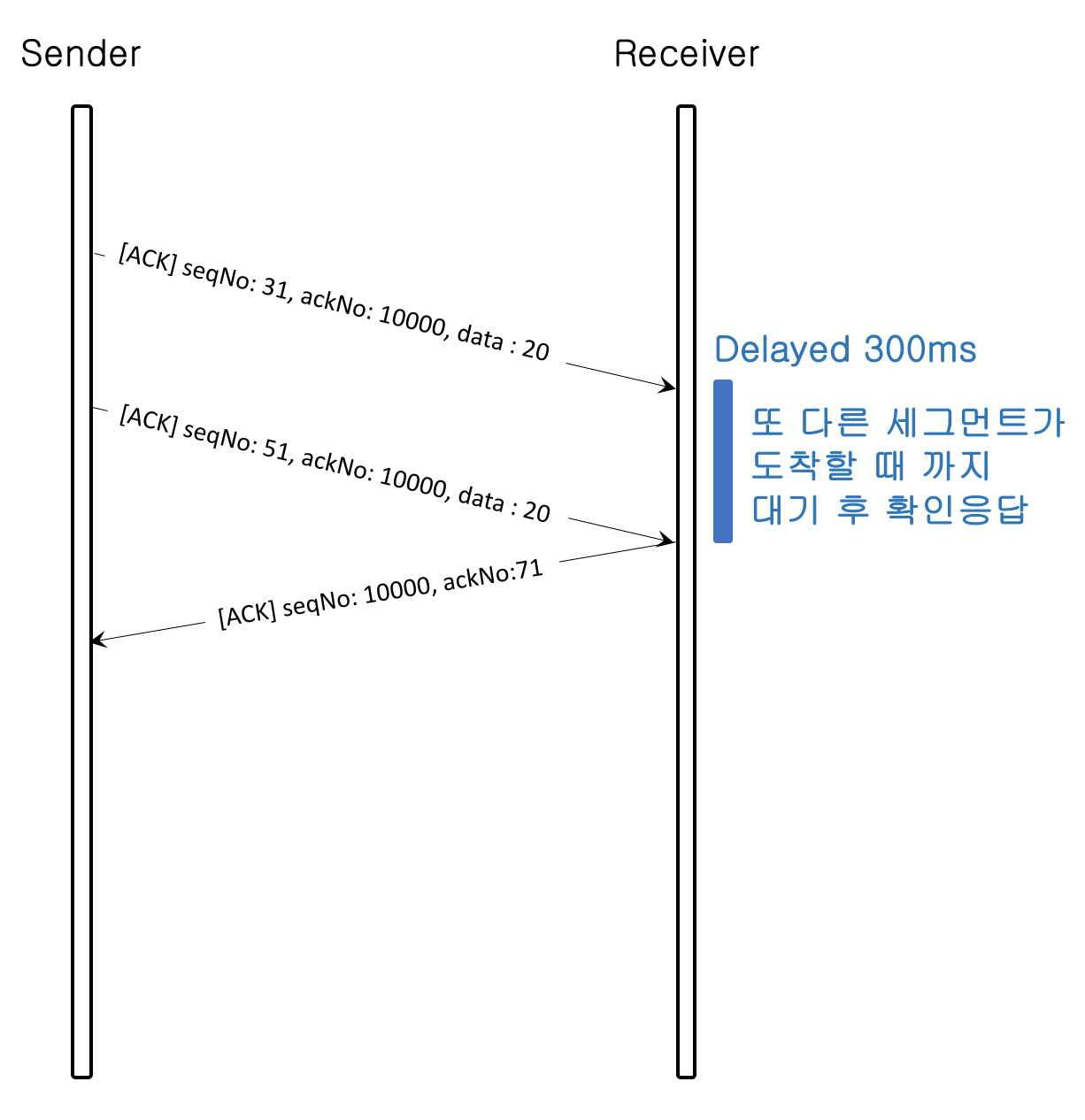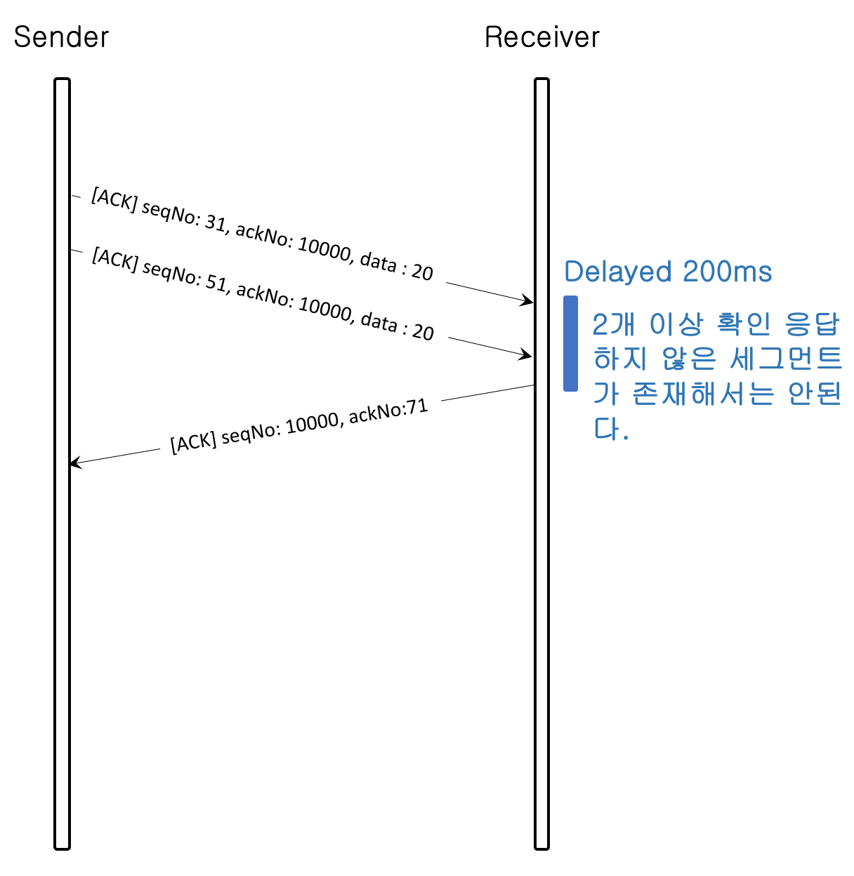 이유는 오랫동안(상대적) 확인 응답을 보내지 않는 경우 송신측에서 세그먼트 재전송을 할 수 있기 때문이다. 세그먼트 재전송은 트래픽 혼잡을 유발 할 수 있다.