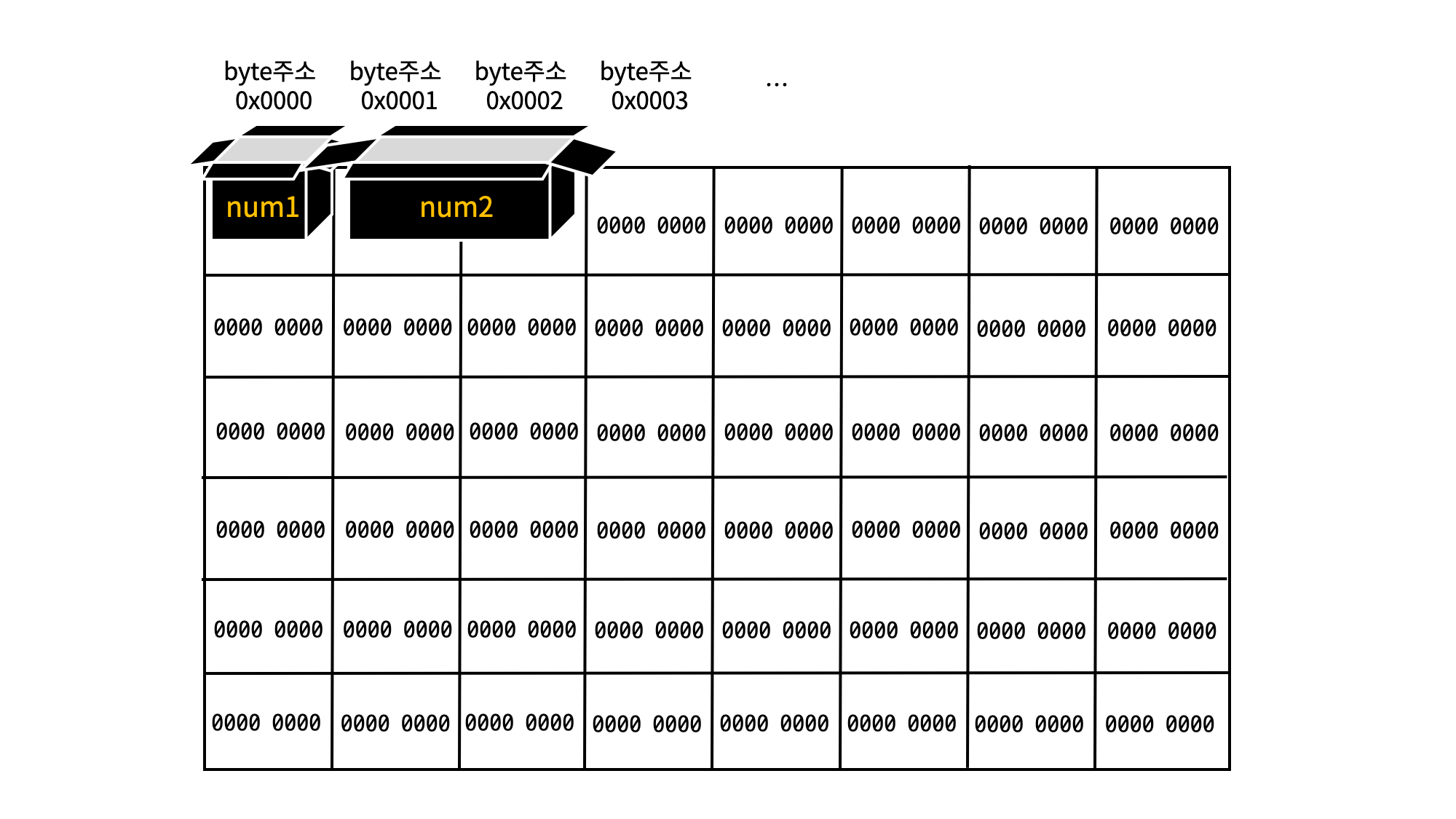엄밀하진 않지만 그래픽적으로 메모리 공간을 보여줄 수 있다면 다음과 같습니다.