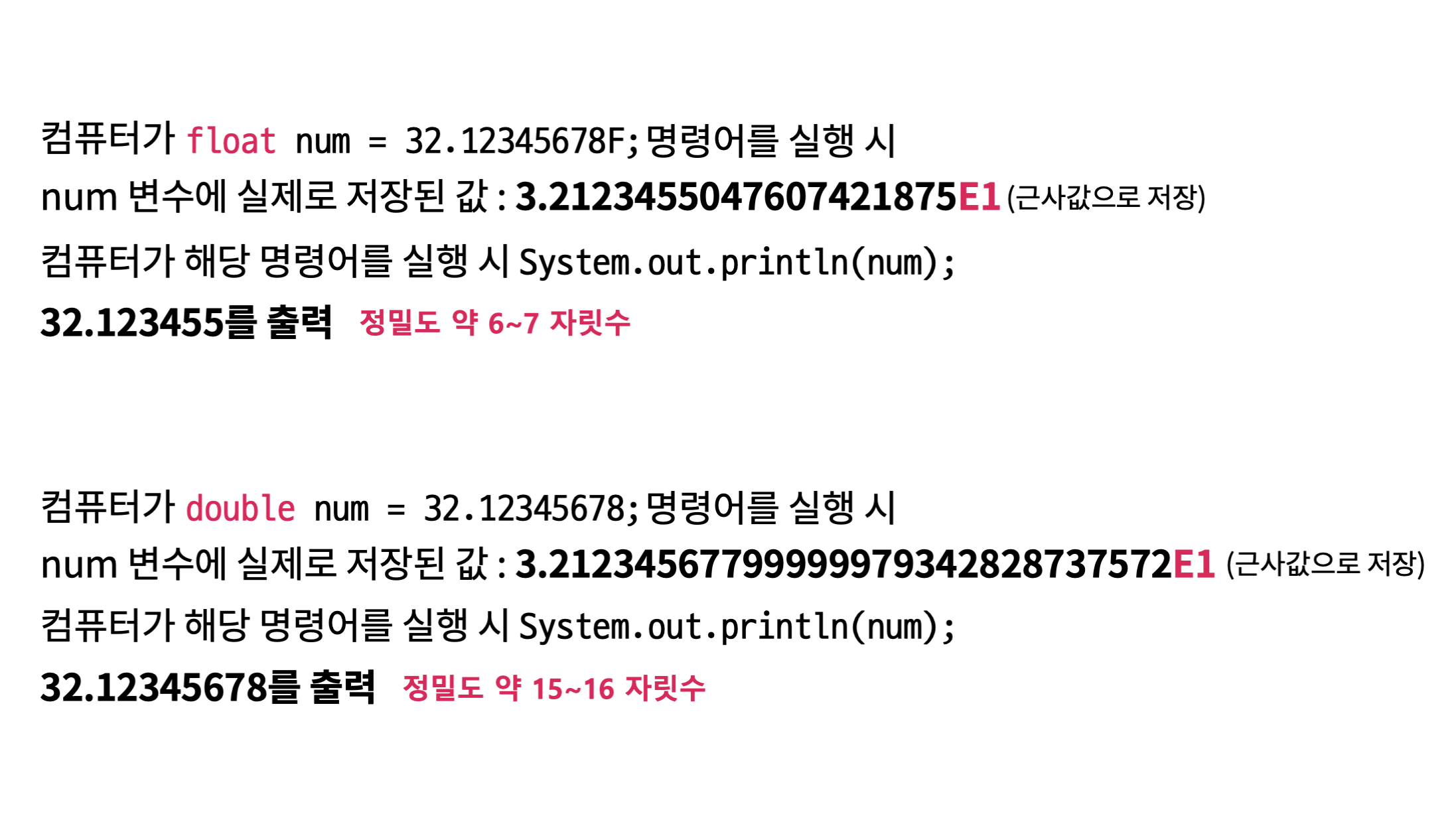 float 자료형 변수와 double 자료형 변수의 차이는 사용할 수 있는 메모리 공간의 차이이며, 실수를 저장할 때 더 많은 bit를 사용할수록 저장하려고 하던 값에 더 근사한 값을 저장할 수 있습니다. 궁금하다면 부동소수점 방식으로 저장하는 법을 참조하세요.