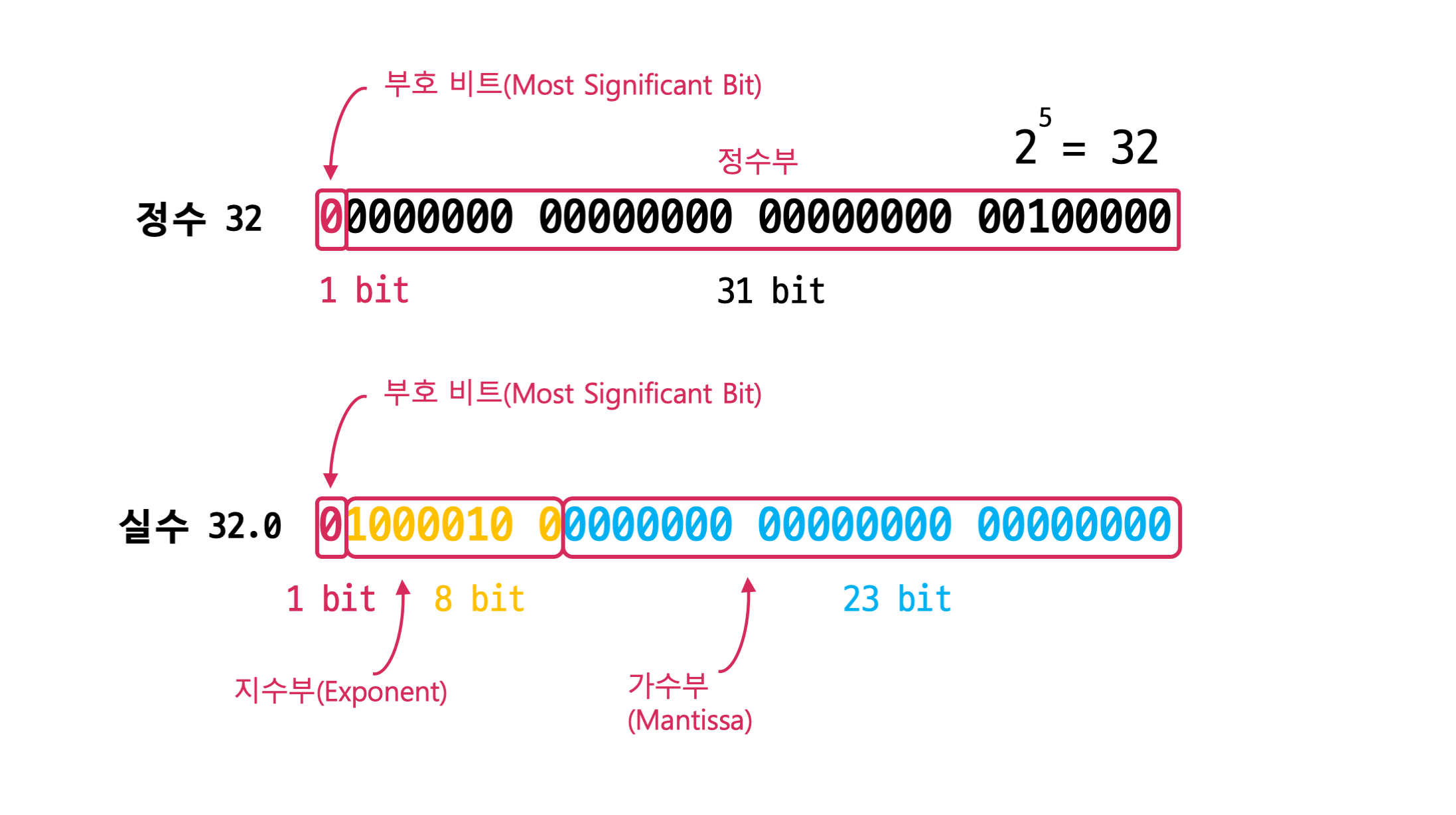 그러나 실수를 저장할 경우 1 bit는 부호 비트로 사용하고, 8 bit는 지수부, 나머지 23 bit는 가수부로 부동소수점 규칙에 의해 계산되어 저장됩니다.