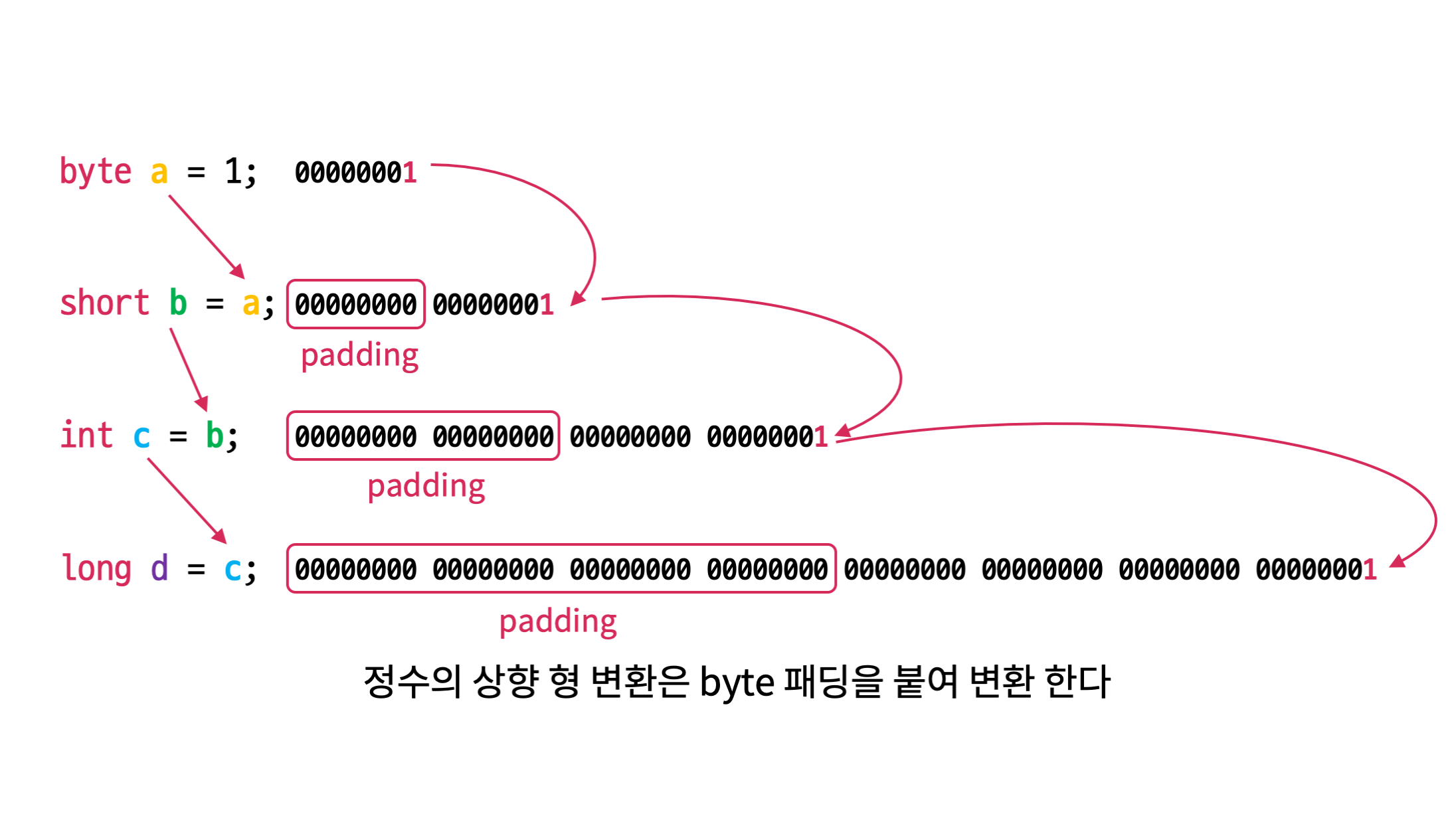 정수의 암시적 형 변환은 byte 패딩을 붙이는 방식으로 형 변환을 합니다.