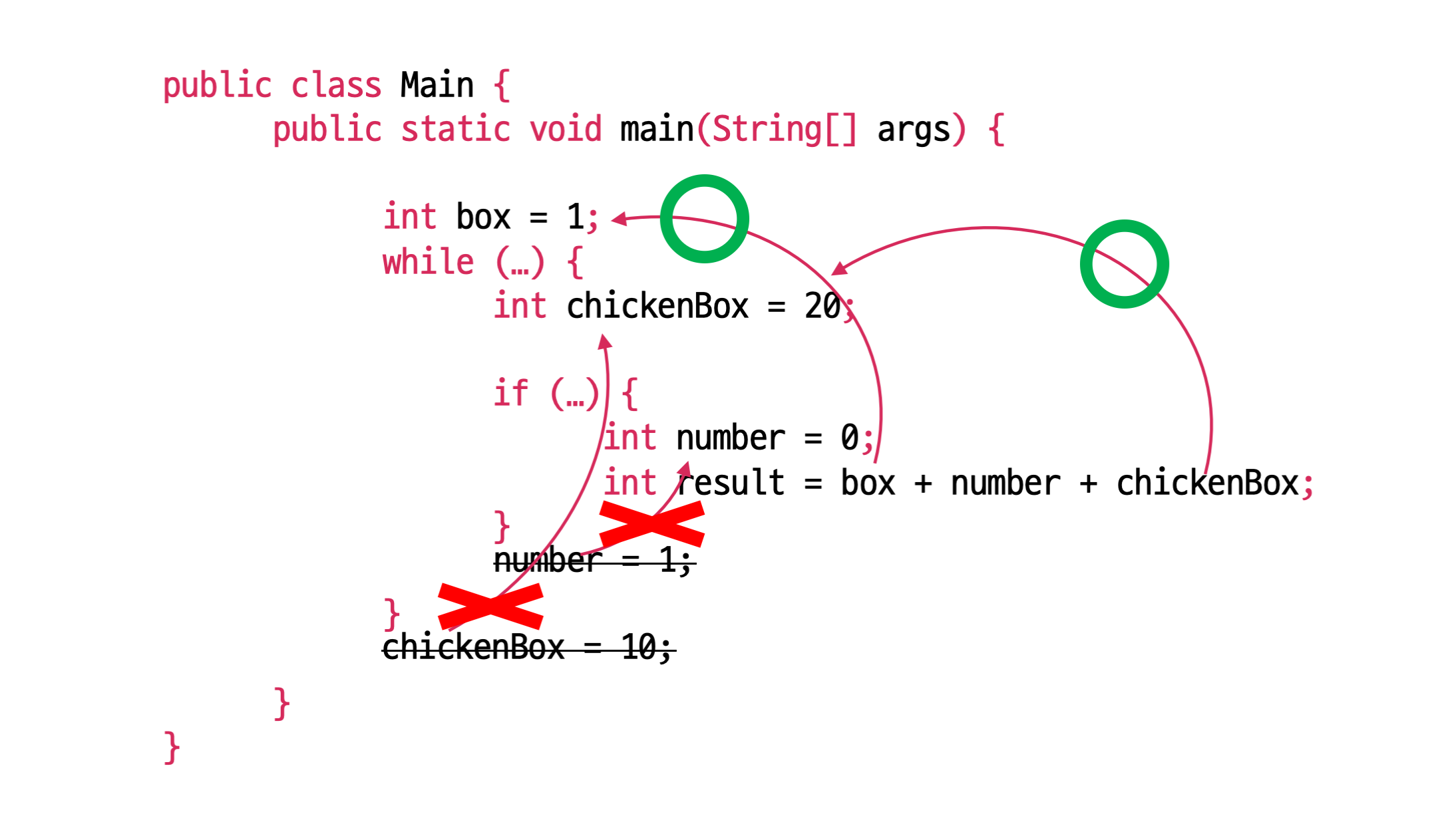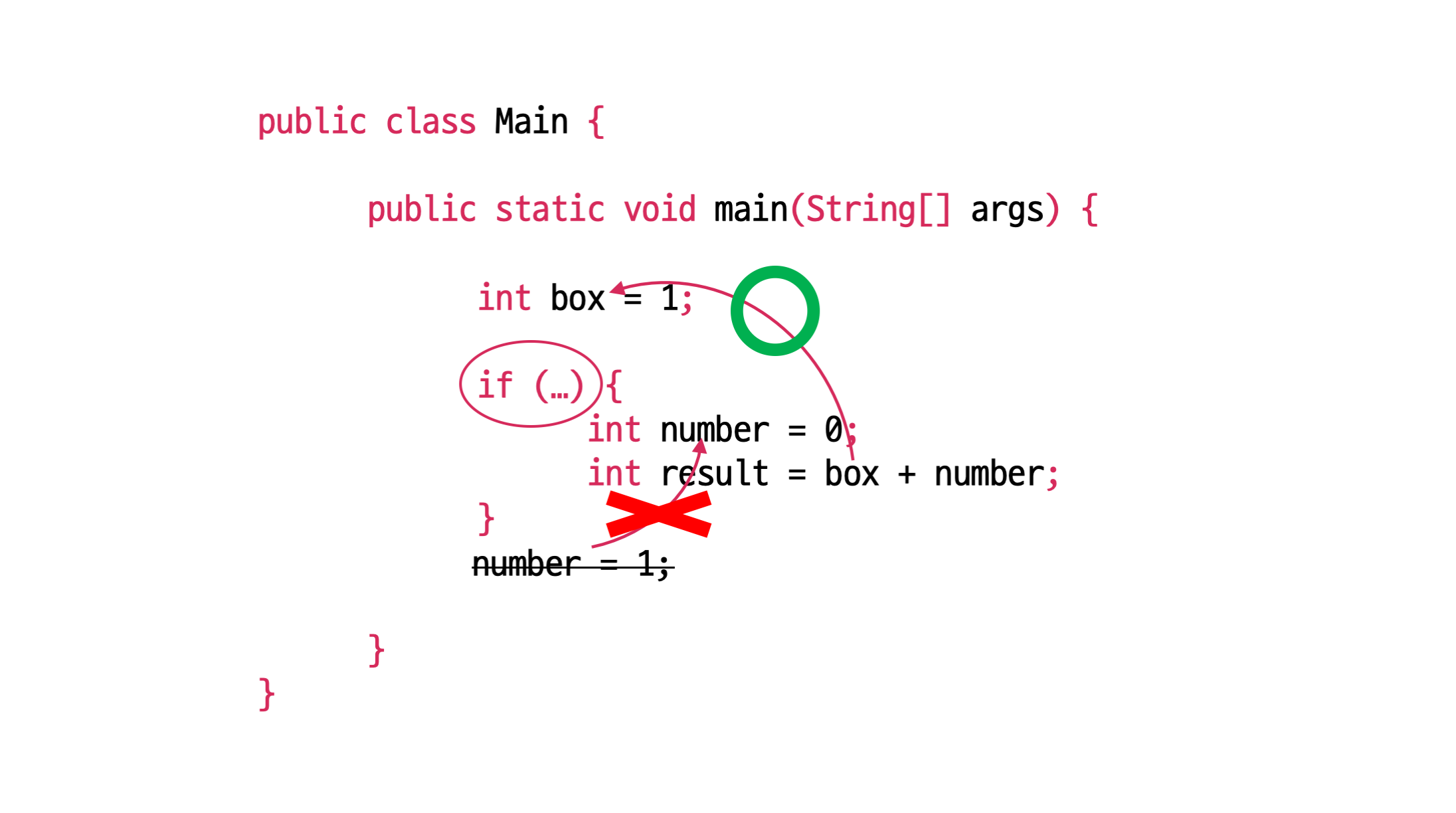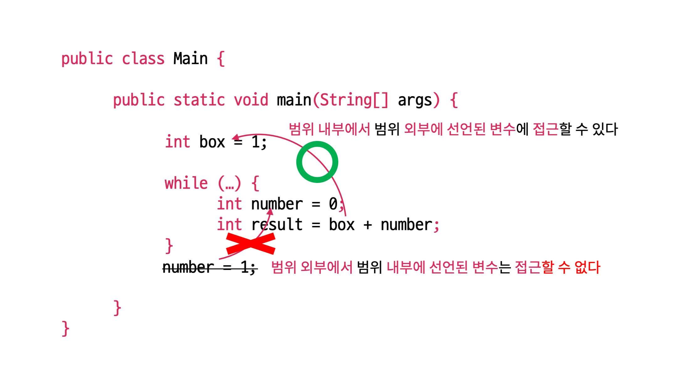 조건문 내부에서는 외부 범위인 box 변수에 접근할 수 있고, chickenBox 변수에 접근할 수 있으나 외부 범위에서는 내부 범위에 선언된 number 변수나 chickenBox 변수에 접근할 수 없습니다.