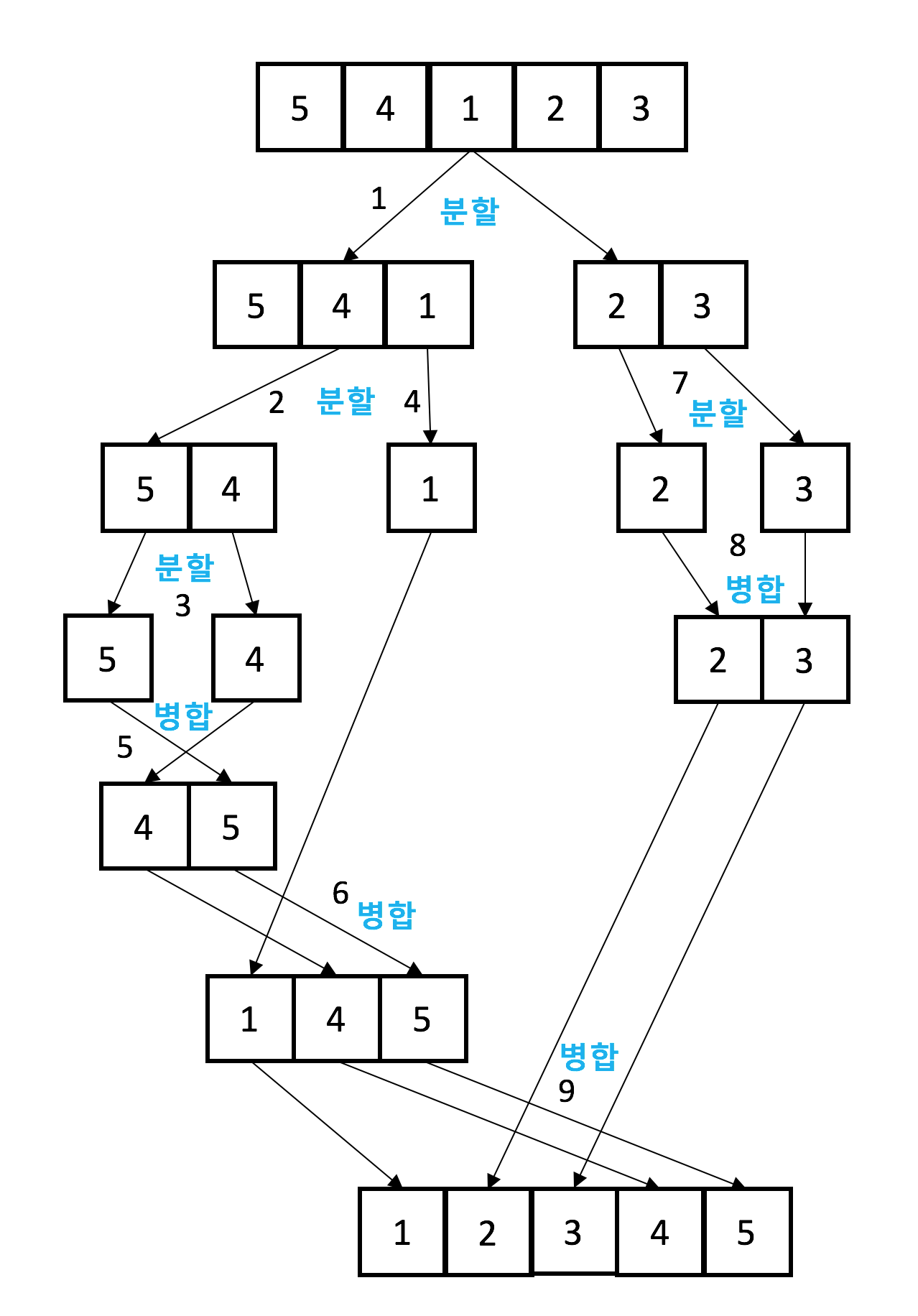 - 정의 : (최소 단위 까지) 배열을 (재귀적으로) 분할 후, 병합 시 (부분 배열의) 앞에서 부터 비교 삽입 하는 정렬