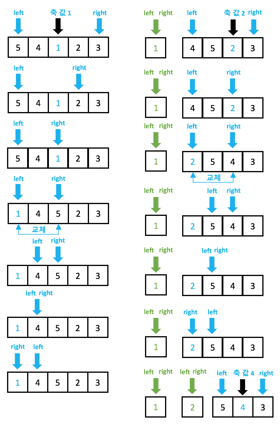 핵심 동작은 축 값과 좌측 값 또는 축 값과 우측 값을 비교 후 좌측 값과 우측 값을 교환한다.